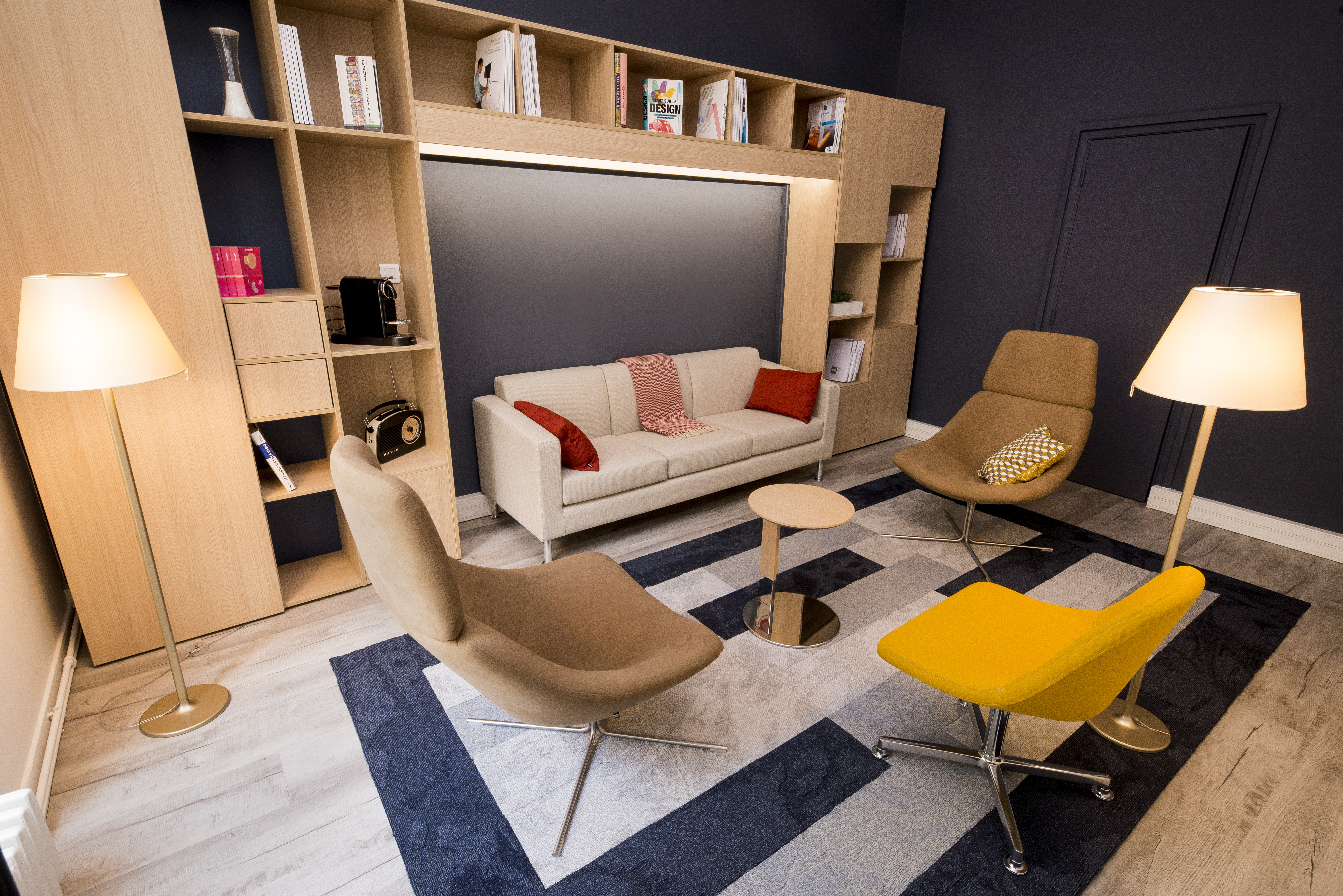 This VIP Co-Working space offering both a meeting room and a lounge area is available free of charge to clients, partners, architects, space-planners, PR, suppliers etc…