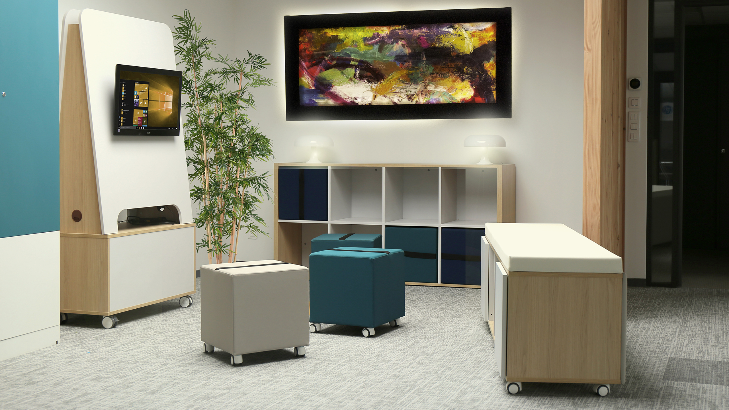 Yam's stands for stylish seats that stow away – good looking, flexible and fun to use. One original idea – a whole multitude of different uses. Perfect for break-out areas or informal meetings, Yam's takes up little space but provides plenty of seating. Just take out the cubes and hey presto! a new bookcase! The cube seats are light and easy to handle, so you can swap them around to suit your mood – or your storage needs.